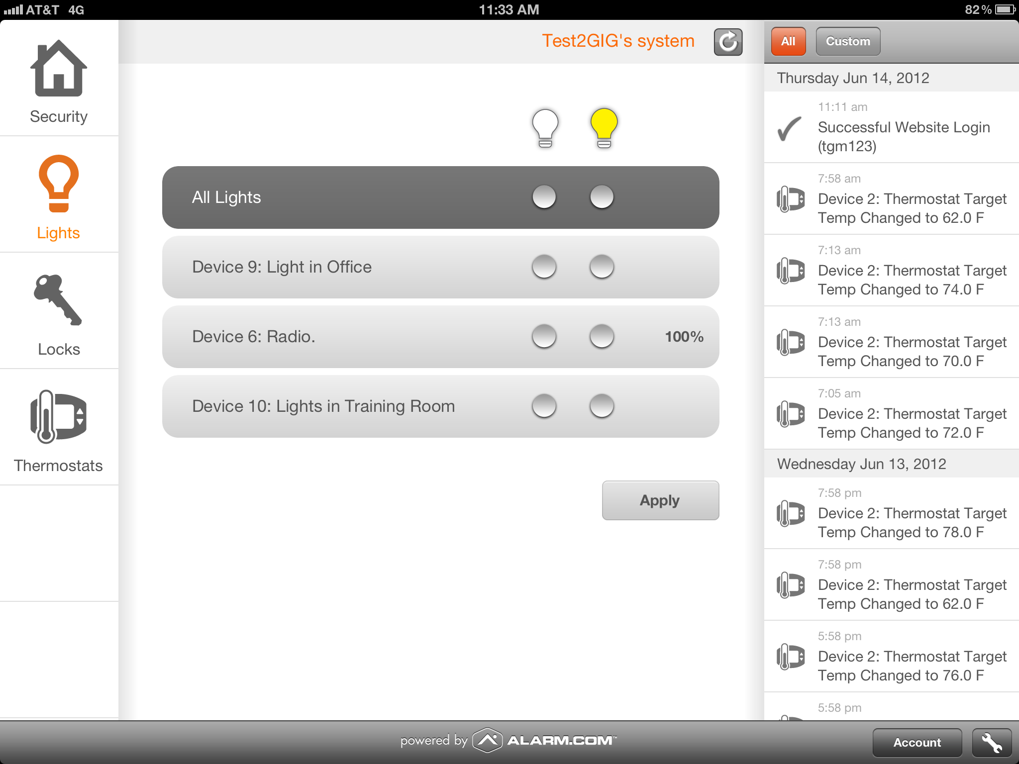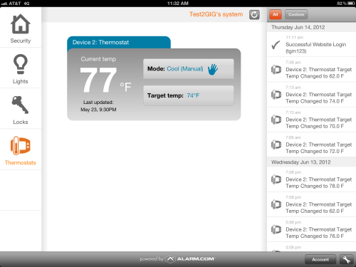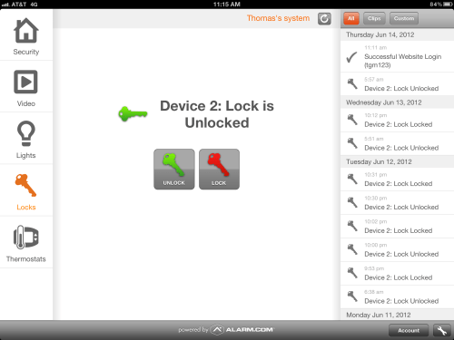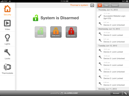 You can arm or disarm your home right from your iPad. You can see the history of what has happened with the system on the right side of the screen.